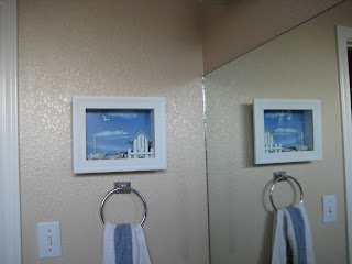 Our downstairs living room is “beach” theme, but the bathroom was not (sorry – I forgot to take photos of “before”). I finally bit the bullet and redecorated the bathroom. Although the Baptismal reception at our house Sunday should have motivated me to finish the project before company came, such was not the case. I finished the day after everyone left. The fun side was getting my Mom and sis’s input during the weekend.