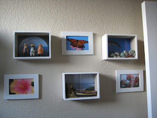My crafty (in an artsy way) Mom helped with the 3 shadowboxes. These were nude, but I spray-painted them white. The photos are from Puerto Rico, my back yard and Florida.